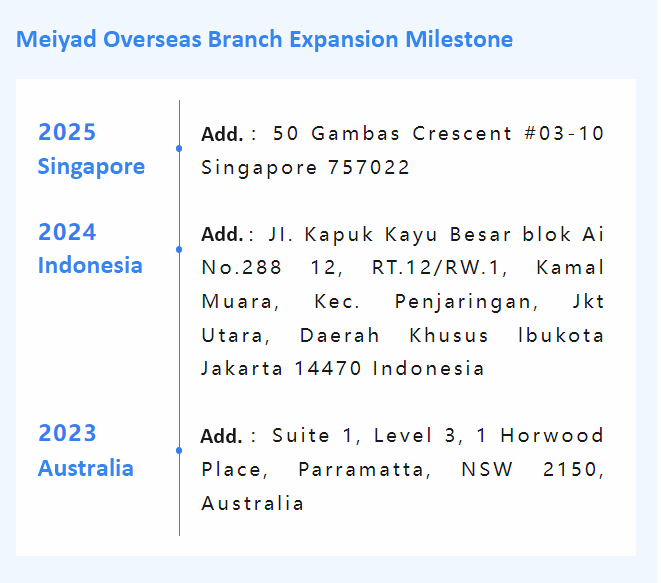 On October 10, 2025, Meiyad's Singapore branch officially opened. This is not only a significant milestone in Meiyad's overseas market development, but also another key step in deepening our presence in the international market and serving global customers.