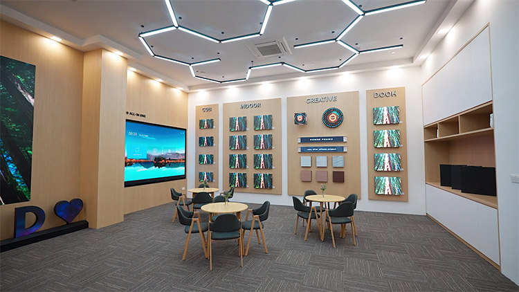 The Singapore branch showcased a wide range of LED display products. Commercial displays included COB LED display, COB all-in-one conference screen, indoor/outdoor fixed LED display, GOB LED display, and outdoor aluminum LED display. Creative products included flexible LED screen, letter LED screen, cube LED screen, round LED screen, spherical LED screen, artistic signage, and wood-grain screens, fully demonstrating Meiyad's strength in producing both standardized and customized products.