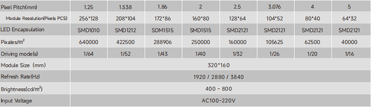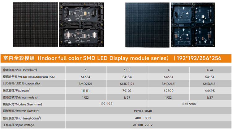 designed to meet diverse needs, from small-scale installations to larger, more intricate setups. The indoor modules are available in several sizes and pixel pitches: